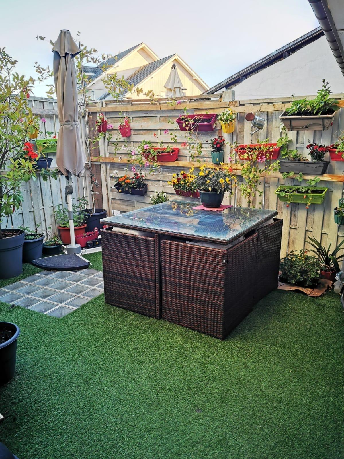 Petite terrasse de 20 m², entièrement close, sans vis-à-vis, abritée du vent – idéale pour profiter des beaux jours en toute intimité
